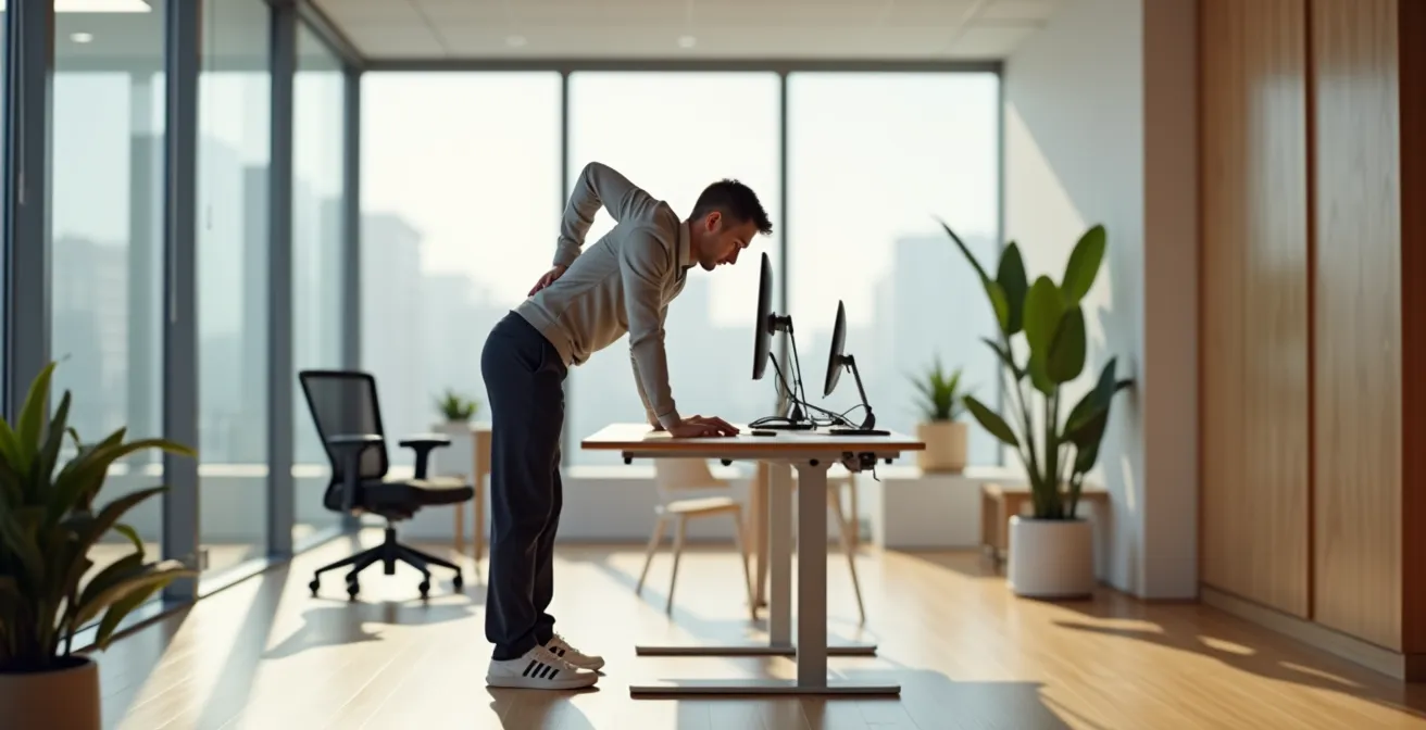 Um Ihnen den Einstieg zu erleichtern, sehen Sie hier drei praxiserprobte Mini-Workouts, die Sie direkt an Ihrem Arbeitsplatz umsetzen können. Diese Übungen benötigen kein Equipment und können unauffällig in kurzen Pausen durchgeführt werden, wie die Person in der folgenden Abbildung, die eine Kaffeepause für eine kurze, aber wirksame Dehnung nutzt.